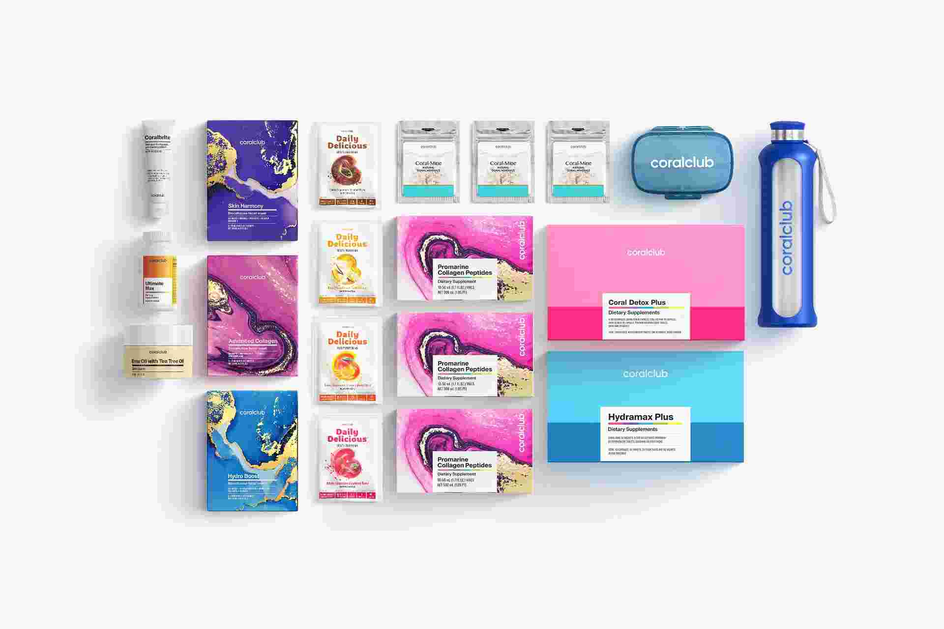 Coral-Mine (3 Pack), ClearWater glass bottle, GoBox midi, Hydramax Plus, Parashield, Promarine Collagen Tripeptides 1-month course, Emu Oil with Tea Tree Oil, Hydroboost, Facial Mask (1 Box), Advanced Collagen Mask (1 Box), Skin Harmony Mask (1 Box), Daily Delicious (Chocolate) 25g, Daily Delicious (Vanilla) 25g, Daily Delicious (Orange-Mango) 25g, Daily Delicious (Raspberry) 25g, Coralbrite, Ultimate Max